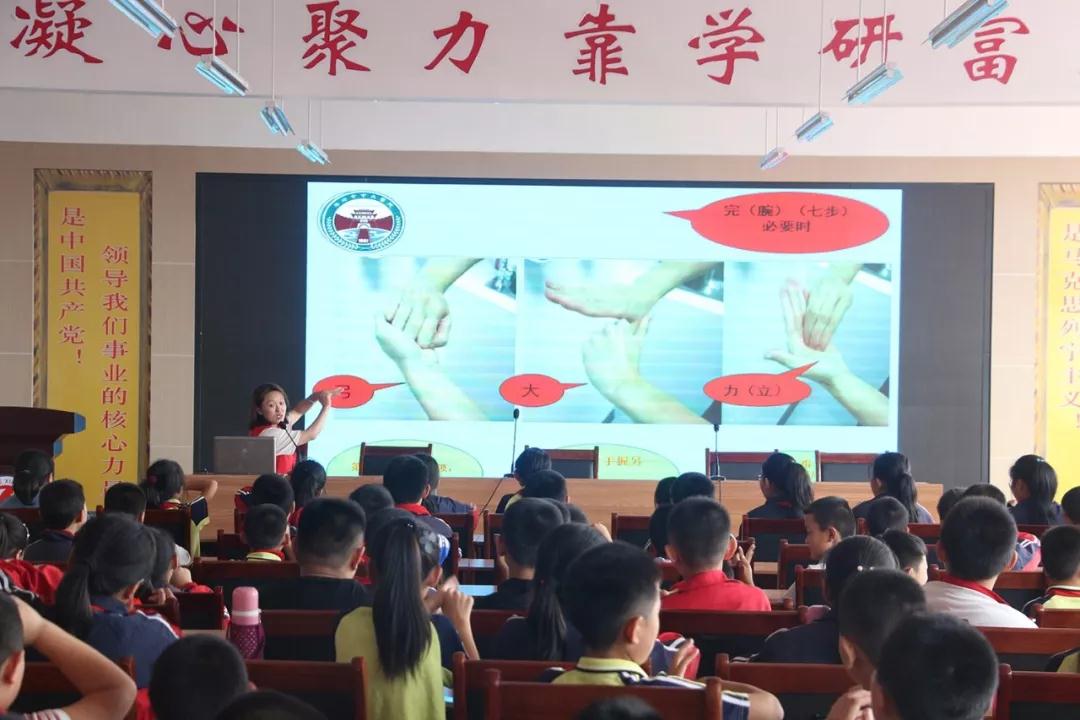 物資發(fā)放結(jié)束后,我院感染管理科副主任劉長(zhǎng)愛(ài)在學(xué)校會(huì)議室為400多名學(xué)生開展了“如何正確洗手”的衛(wèi)生知識(shí)講座。劉主任首先為學(xué)生們介紹了猩紅熱、水痘、流行性感冒、手足口病等學(xué)校內(nèi)主要傳染病的特點(diǎn),從個(gè)人預(yù)防、學(xué)校防控兩個(gè)方面講解了預(yù)防措施,重點(diǎn)突出了手衛(wèi)生的重要性,隨后將六步洗手法進(jìn)行現(xiàn)場(chǎng)示范,并結(jié)合動(dòng)畫短片形象生動(dòng)地展示給同學(xué)們。