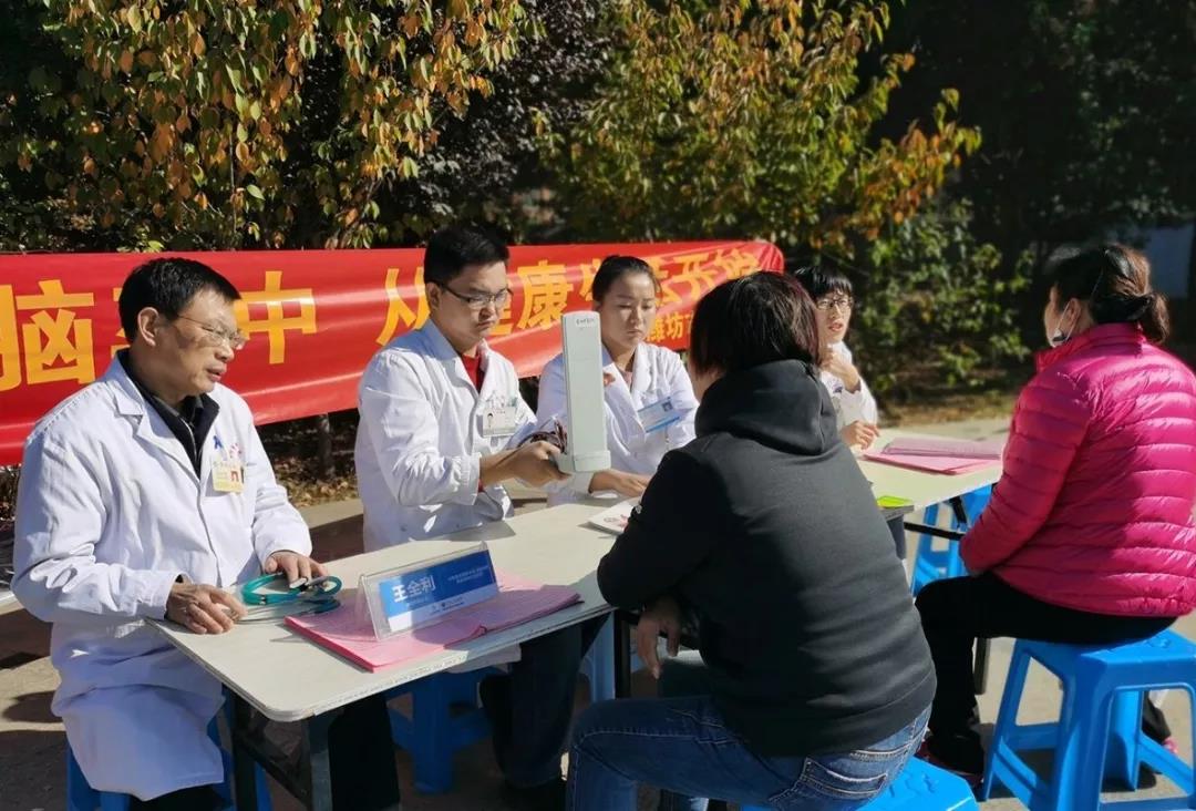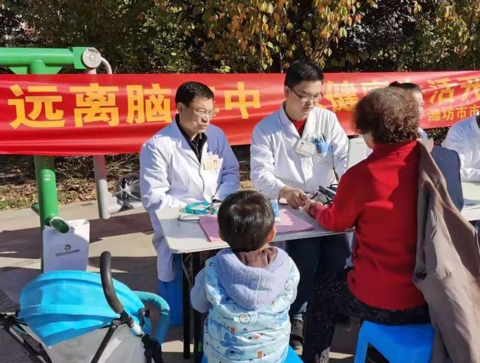 為進(jìn)一步提高居民腦卒中防治意識,倡導(dǎo)健康生活方式。10月29日上午,在濰城區(qū)疾控中心統(tǒng)一組織下,我院神經(jīng)內(nèi)科來到濰城區(qū)清平花園小區(qū)文化活動廣場開展主題為“遠(yuǎn)離卒中 從健康生活開始”的義診宣教活動。