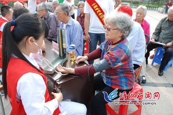 濰坊市市立醫(yī)院的志愿者們?yōu)槔先藴y試血壓