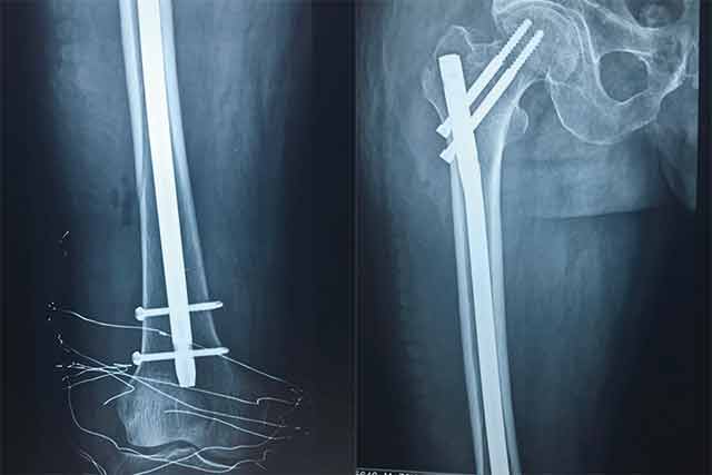 經(jīng)過骨科專家團(tuán)隊(duì)的詳細(xì)查體以及相關(guān)拍片、CT等輔助檢查,韓大爺被診斷為右側(cè)的股骨干骨折合并同側(cè)粗隆間骨折。通過和病人及家屬耐心細(xì)致地溝通,韓大爺收住我院骨科。經(jīng)過詢問病史,了解到韓大爺有胃出血及疝修補(bǔ)手術(shù)史約10余年,并伴有老年高血壓病史,年事已高、病情復(fù)雜,需要制定更為詳細(xì)的診療方案。骨科主任楊連海及副主任孫守全立即組織科內(nèi)討論,充分與患者家屬進(jìn)行溝通、以得到家屬的認(rèn)可,細(xì)致而縝密地結(jié)合病人的個(gè)體情況定制手術(shù)方案。由于病情復(fù)雜,麻醉科主任修冬云在手術(shù)前親自看望韓大爺?shù)纳眢w狀況,認(rèn)真分析評(píng)估手術(shù)的風(fēng)險(xiǎn)程度,排除手術(shù)禁忌,選擇合適的麻醉方式。經(jīng)過積極的術(shù)前準(zhǔn)備,孫守全副主任擇期在硬膜外麻醉下完成了髖部骨折+同側(cè)股骨干骨折髓內(nèi)重建釘?shù)膬?nèi)固定手術(shù),手術(shù)過程非常順利,骨折復(fù)位基本達(dá)到解剖復(fù)位。術(shù)后經(jīng)過預(yù)防感染、鎮(zhèn)痛、預(yù)防下肢深靜脈血栓等治療,韓大爺恢復(fù)的非常好,沒有出現(xiàn)感染、血栓等并發(fā)癥,而且傷口甲級(jí)愈合。