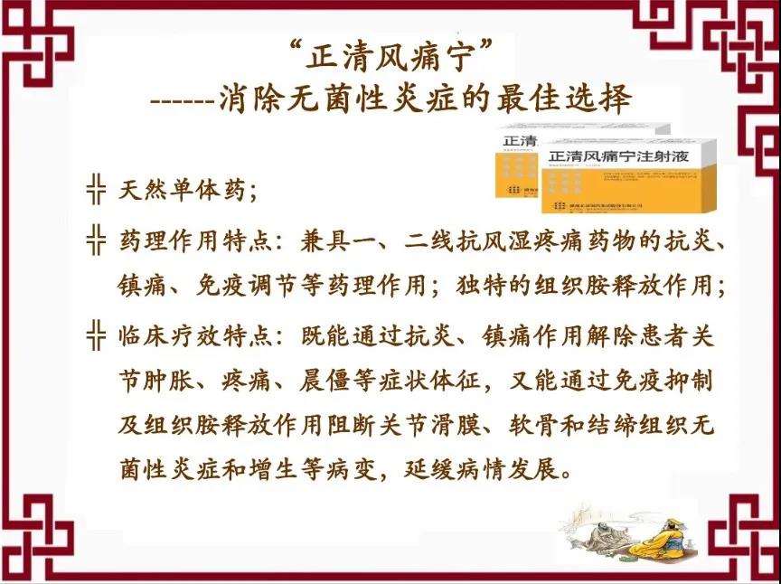 正清風(fēng)痛寧,純中藥制劑,具有消炎止痛,改善微循環(huán),輕度免疫抑制的作用,肝腎功能無毒副作用,具有療效確切、操作簡便、安全可靠等特點。對解除關(guān)節(jié)疼痛,改善膝關(guān)節(jié)功能,促進關(guān)節(jié)修復(fù),正清風(fēng)痛寧三聯(lián)序貫療法,短期有非??隙ǖ闹委熜Ч?。此療法強調(diào)將抗炎藥物直接注入到炎性病灶內(nèi)以消除軟組織及周圍神經(jīng)的各類慢性炎癥,即通過抗炎而達(dá)到鎮(zhèn)痛和肌松的目的,不用激素卻可解決慢性痛癥,真正解決了大多數(shù)患者的“激素恐懼”及對“封閉”的排斥問題。