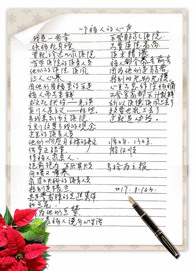 2017年是我院的“醫(yī)療服務(wù)提升年”,醫(yī)院以此為契機,大力推進深化改革和改善服務(wù),不斷加強醫(yī)療服務(wù)管理,提高醫(yī)療服務(wù)水平,提高患者就醫(yī)感受。在提升服務(wù)的路上,市立人牢牢把握“為健康創(chuàng)立價值”的核心價值觀,用“心”服務(wù),用“愛”溫暖,用“情”溝通,收獲了患者的健康、感謝和感恩。