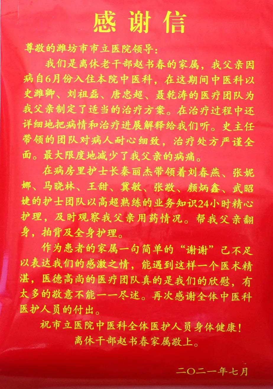 “能遇到這樣一個醫(yī)術精湛、醫(yī)德高尚的醫(yī)療團隊,真是我們的欣慰!”這是一封情真意切的感謝信,飽含一位老人及其家人對濰坊市市立醫(yī)院中醫(yī)科全體醫(yī)護人員的感激之情,這是對長久以來醫(yī)院全體醫(yī)護人員傾力奉獻的最佳肯定。