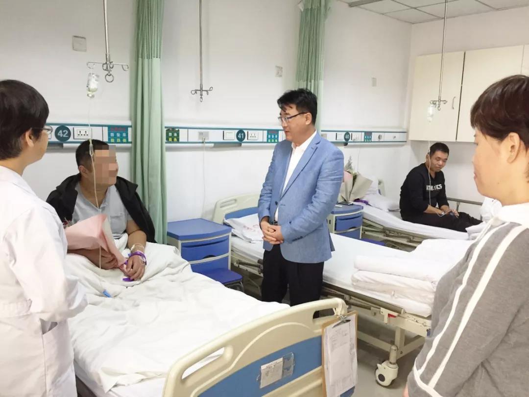 10月8日上午,山醫(yī)集團(tuán)副主席、濰坊市市立醫(yī)院院長(zhǎng)靳清漢,副院長(zhǎng)解魯明,院長(zhǎng)助理劉偉組成慰問(wèn)組前往五官科病房看望考先生,與他面對(duì)面交流,詢問(wèn)病情及生活狀況,為他送上鮮花、慰問(wèn)品及健康的祝福。