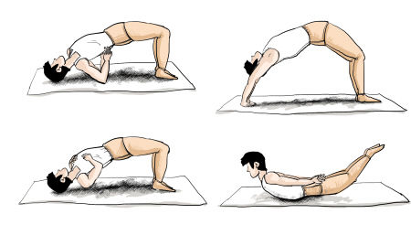 (1)五點支撐法:患者仰臥木板床上,用頭部、雙肘部及雙足跟撐起全身,使背部盡量騰空后伸。
