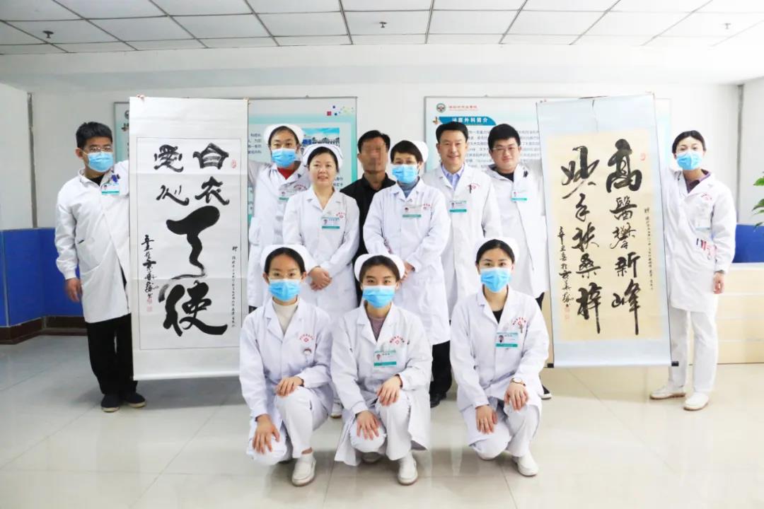 為表達(dá)對(duì)解院長(zhǎng)精湛醫(yī)術(shù)治愈病痛的感激之情,崔先生專程找到中國(guó)華夏萬里行書畫家協(xié)會(huì)院士、中國(guó)民俗文化研究院院士、創(chuàng)意書法家李凈才先生創(chuàng)作了兩幅書法作品,親自送到了醫(yī)護(hù)人員手中。“這是我的心意,只為表達(dá)我對(duì)解院長(zhǎng)和所有盡心負(fù)責(zé)的醫(yī)護(hù)人員的感激之情!”崔先生握著解院長(zhǎng)的手笑著說道。