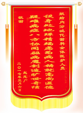 2017年4月上旬,內(nèi)分泌代謝科病房又出現(xiàn)了和諧一家人的一幕?;颊呒覍仝w先生與其老父親將一面寫(xiě)有設(shè)身處地 殫精竭慮 為病人鑄就高尚醫(yī)學(xué)的錦旗送到我科醫(yī)護(hù)人員的手中,向內(nèi)分泌代謝科全體醫(yī)護(hù)人員表示衷心的感謝。趙先生表示,老父親住院期間,醫(yī)生們精湛的醫(yī)術(shù)、護(hù)士們的細(xì)心護(hù)理、無(wú)微不至的關(guān)懷,使老人的疾病得到了全面的治療,尤其是醫(yī)護(hù)人員的優(yōu)質(zhì)服務(wù)令我