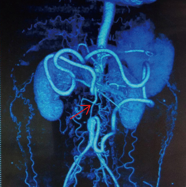 (病人術前的相關影像學檢查資料:紅色箭頭處顯示主動脈腎下段充盈缺損,周圍側支循環(huán)建立)