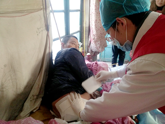 上午9時(shí)許,我院志愿者攜帶好相關(guān)醫(yī)療設(shè)備以及治療藥品到達(dá)周先生的家中。王吉濱醫(yī)生詳細(xì)詢問(wèn)了周先生的病程,首先對(duì)周先生的褥瘡部位進(jìn)行了細(xì)致入微的檢查。發(fā)現(xiàn)周先生的發(fā)病部位潰爛嚴(yán)重,潰爛深度已達(dá)腿骨、盆骨等處,炎癥癥狀明顯。王吉濱醫(yī)師與胡彩云護(hù)士長(zhǎng)針對(duì)周先生病情,通力協(xié)作,對(duì)周先生的瘡口部位進(jìn)行瘡口消毒換藥和隔離保護(hù)等措施,并向周先生及其家人耐心詳細(xì)地教授其疾病的日常護(hù)理知識(shí),并告知周先生我院將會(huì)繼續(xù)組織志愿者定期為周先生進(jìn)行醫(yī)療救助,盡最大的努力減輕周先生的痛苦和負(fù)擔(dān)。