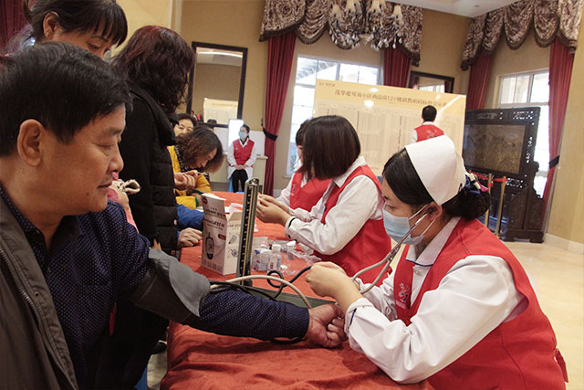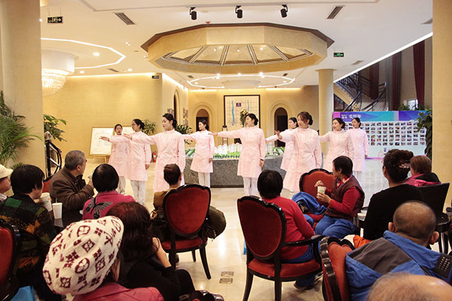 活動開始后,小區(qū)的老人蜂擁而至,在志愿者們的合理安排下,他們有序地排隊體檢,咨詢健康問題,醫(yī)院專家認(rèn)真為老人檢查身體,耐心回答老人提出的有關(guān)醫(yī)療保健方面的問題。內(nèi)分泌代謝科主任助理李雯對老人進行了膳食搭配指導(dǎo),并針對糖尿病等慢性病進行了詳細(xì)的醫(yī)療保健指導(dǎo);我院志愿者還為老人帶來了豐富的文藝演出,我院志愿者徐維乾朗誦了慷慨激昂的“志愿頌”,展現(xiàn)了我院志愿者的良好精神風(fēng)貌,手語舞“感恩的心”賞心悅目,表現(xiàn)出了我院護理人員的嶄新風(fēng)采,贏得了老人的陣陣掌聲。