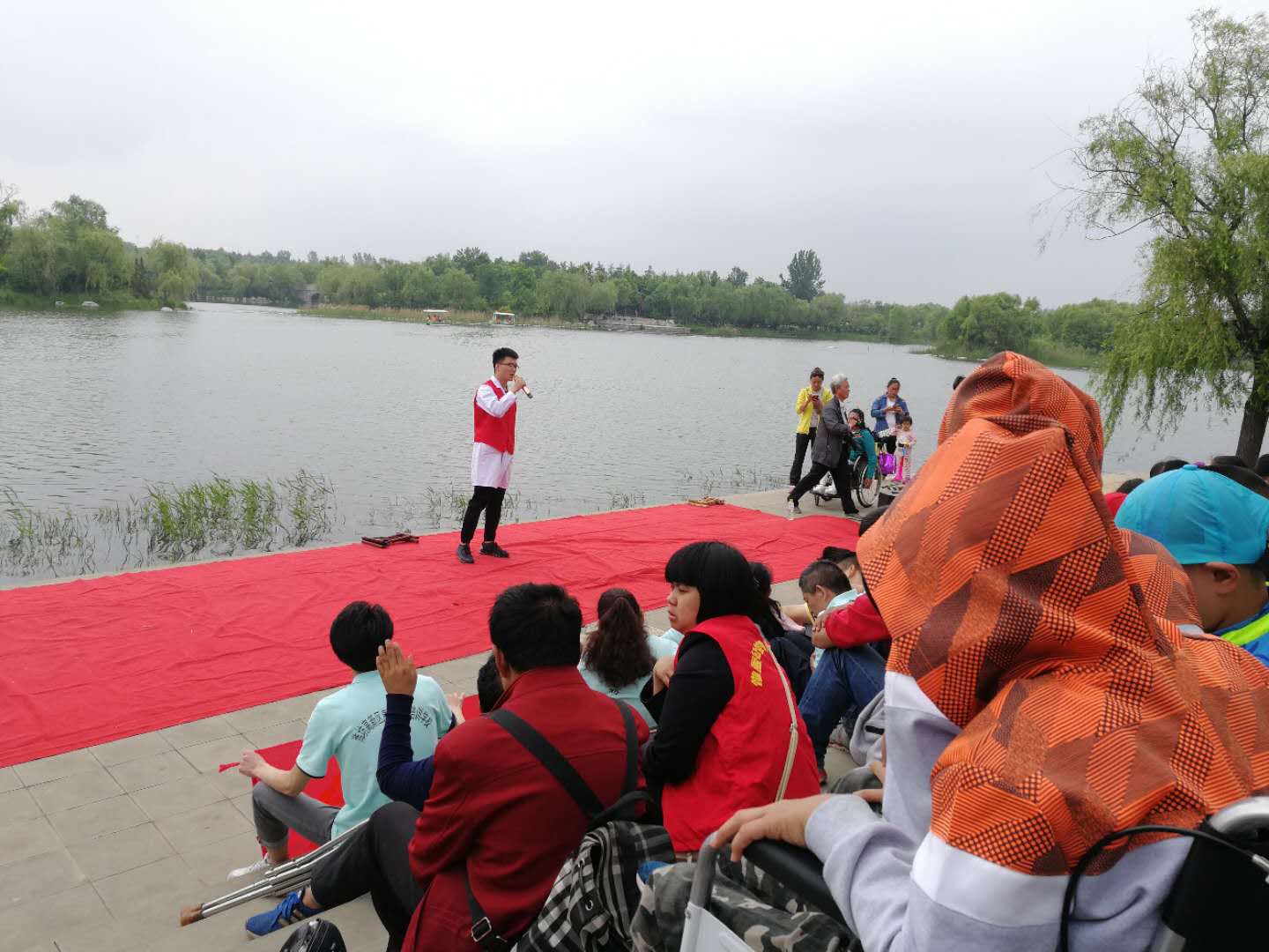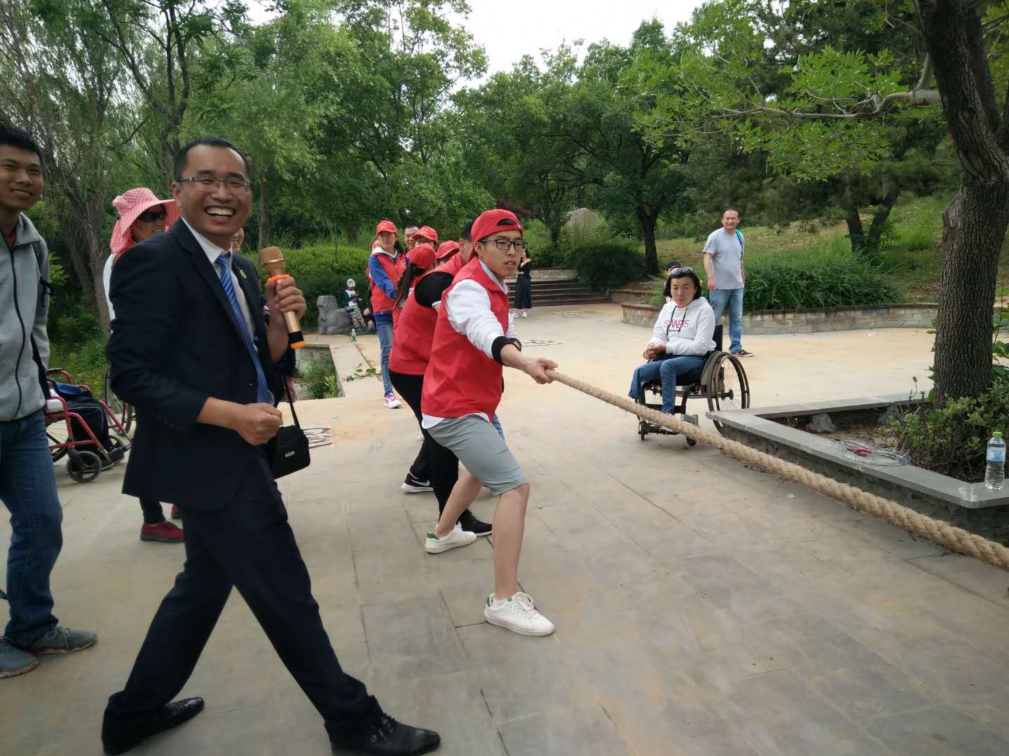 活動中,志愿者們和殘友們帶上各自精心準(zhǔn)備的拿手好戲,或歌或舞,相聚一堂,一起相約投身到大自然的懷抱去,一起分享開心和快樂,增進(jìn)彼此之間的感情,其中我院志愿者帶來了歌曲《一生有你》,表達(dá)了志愿者和殘友之間相親相愛一家人的友愛精神。文藝節(jié)目后是殘友互動環(huán)節(jié),緊張激烈的輪椅拔河比賽把活動帶入高潮!加油助威聲、歡笑聲此起彼伏,久久飄蕩在白浪河濕地公園上空。