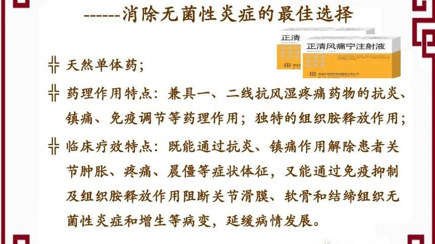 正清風痛寧,純中藥制劑,具有消炎止痛,改善微循環(huán),輕度免疫抑制的作用,肝腎功能無毒副作用,具有療效確切、操作簡便、安全可靠等特點。對解除關(guān)節(jié)疼痛,改善膝關(guān)節(jié)功能,促進關(guān)節(jié)修復(fù),正清風痛寧三聯(lián)序貫療法,短期有非??隙ǖ闹委熜Ч4睡煼◤娬{(diào)將抗炎藥物直接注入到炎性病灶內(nèi)以消除軟組織及周圍神經(jīng)的各類慢性炎癥,即通過抗炎而達到鎮(zhèn)痛和肌松的目的,不用激素卻可解決慢性痛癥,真正解決了大多數(shù)患者的“激素恐懼”及對“封閉”的排斥問題。