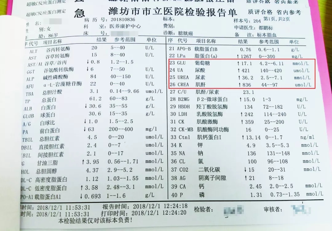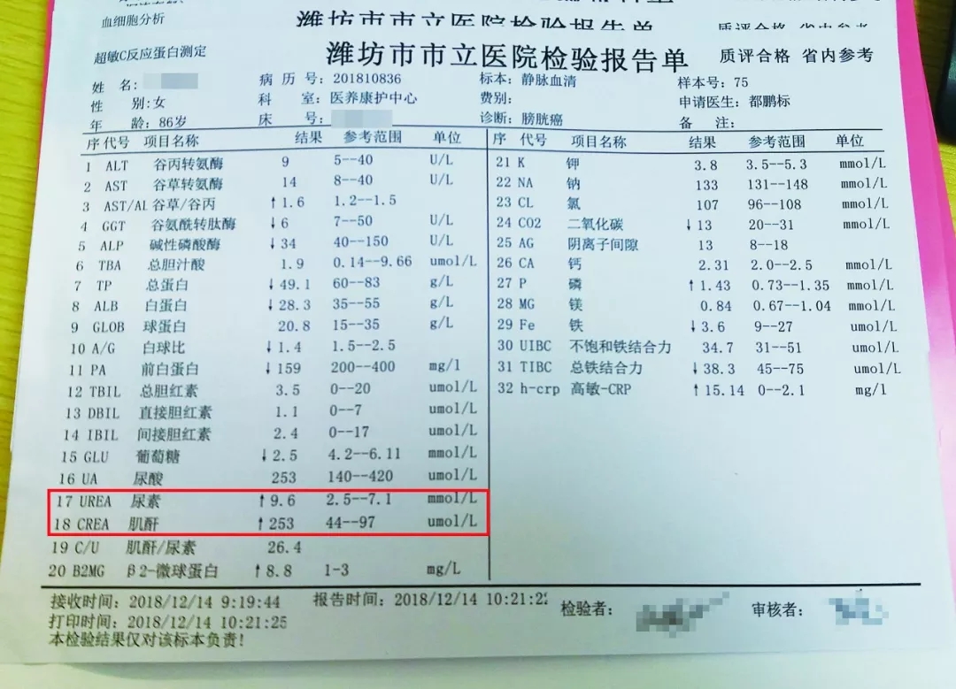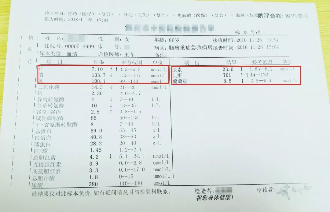 經(jīng)過2周治療,患者病情逐漸好轉(zhuǎn),目前意識(shí)清楚,言語流利,思維清晰,已經(jīng)能自己經(jīng)口進(jìn)食了,于是拔出胃管,讓其自行進(jìn)食,血壓、血氧飽和度、血糖都很平穩(wěn),撤掉心電監(jiān)護(hù)儀,停掉面罩吸氧,改為鼻導(dǎo)管吸氧,住院期間多次化驗(yàn)?zāi)I功能,血肌酐、尿素氮逐漸下降,目前血肌酐已經(jīng)降至253umol/L,尿素氮降至9.6mmol/L,白細(xì)胞10.53×10^9/L,超敏C反應(yīng)蛋白15.14mg/L,雙肺呼吸音清,聽診未聞及干濕性啰音,肢體無浮腫。