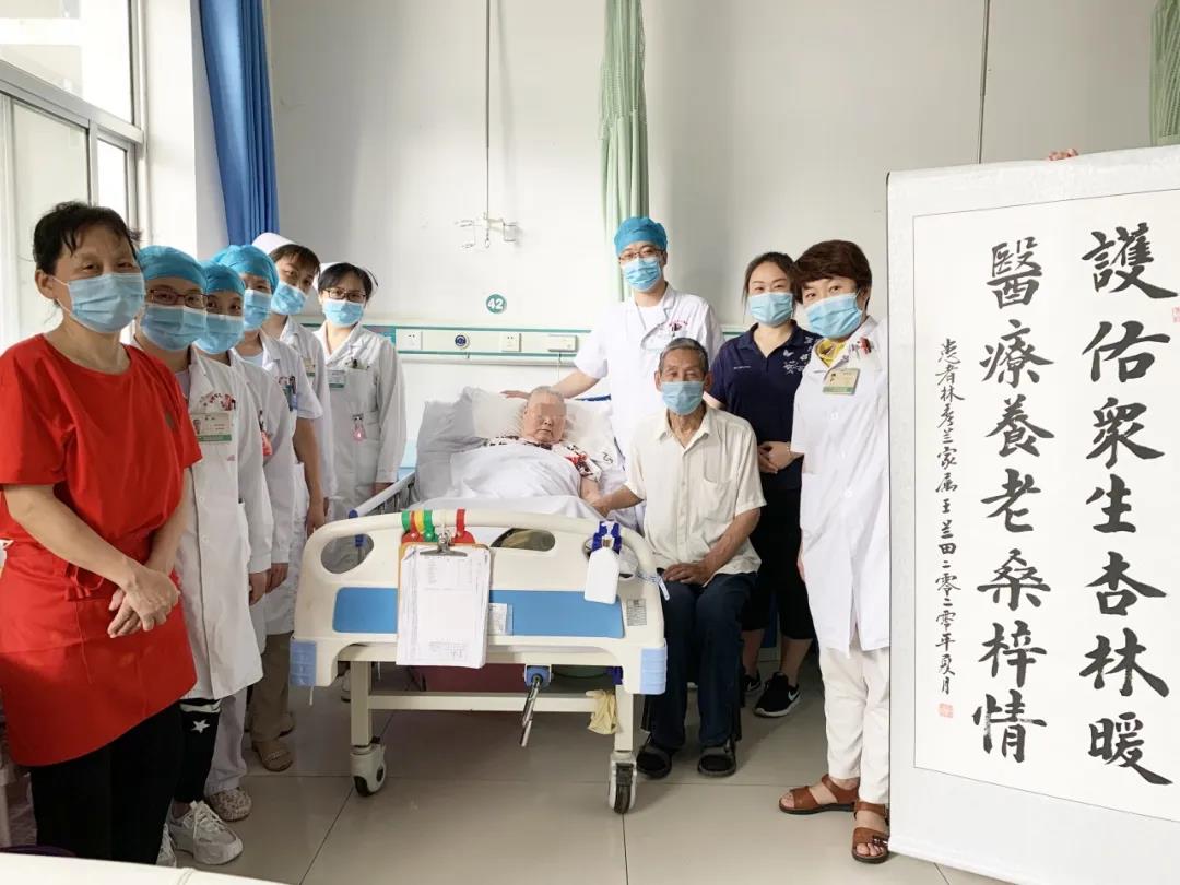 2019年12月,林大姨的老伴王大爺就滿懷激動地寫了感謝信送到了科室,以表達(dá)對醫(yī)養(yǎng)結(jié)合一病區(qū)全體醫(yī)護(hù)人員的感謝。2020年7月10日上午,王大爺又送來了裝裱好的書法“護(hù)佑眾生杏林暖,醫(yī)療養(yǎng)老桑梓情”來表達(dá)感激之情。這是王大爺幾經(jīng)斟酌寫的作品,充分表現(xiàn)了醫(yī)養(yǎng)結(jié)合對疾病纏身、長期臥床老人的重要性。杏林很多人都知道是中醫(yī)學(xué)界的代稱,現(xiàn)在也泛指整個醫(yī)學(xué)界,那么桑梓是什么意思呢?為什么會用“桑梓”來對“杏林”?《詩經(jīng).小雅》:“維桑與梓,必恭敬之。”是說家鄉(xiāng)的桑樹和梓樹是父母種的,對它要表示敬意,后人用“桑梓”借指故鄉(xiāng),離鄉(xiāng)的人在外地看到桑梓樹時就會懷戀自己的家鄉(xiāng),王大爺已經(jīng)把醫(yī)養(yǎng)結(jié)合一病區(qū)當(dāng)成自己的故鄉(xiāng)了,寓意在這里既能享受醫(yī)療還能養(yǎng)老,盡享天倫之樂,真正是做到落葉歸根了,同時也表達(dá)了對市立醫(yī)院乃至整個醫(yī)學(xué)界的敬意!