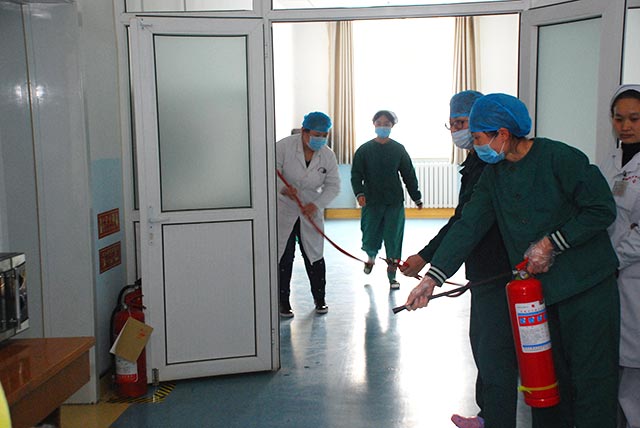 “跌倒/墜床”應(yīng)急演練結(jié)束后,全院護(hù)士長及護(hù)理骨干來到重癥醫(yī)學(xué)科開展火災(zāi)消防演練。首先,由周志慧護(hù)士長簡單講解了演練過程中需要注意的問題及演練流程,演練正式開始。當(dāng)接到監(jiān)護(hù)室微波爐起火的報告,所有在班醫(yī)務(wù)人員有序的按照消防流程開始,負(fù)責(zé)滅火的迅速拿起滅火器滅初期小火,見火勢未得到控制,另外兩人迅速鋪開滅火水龍帶進(jìn)行滅火。辦公桌前工作的人員立即拿起電話通知醫(yī)院保衛(wèi)科,醫(yī)院總值班室,當(dāng)收到火勢沒有得到有效控制的通知時,立即撥打119火災(zāi)電話報警。同時立即開放安全通道,將科室總電源開關(guān)關(guān)閉,三名工作人員迅速攜帶簡易呼吸器來到一名危重患者的床旁,收拾監(jiān)護(hù)儀,拔掉氣墊床,保護(hù)好液體通道,將濕透的紗布覆蓋在病人口鼻部,迅速將其轉(zhuǎn)運至安全場所后,又在做好自我防護(hù)的前提下,返回火災(zāi)現(xiàn)場,將呼吸機(jī),除顫儀等貴重醫(yī)療設(shè)備轉(zhuǎn)運出火災(zāi)現(xiàn)場。同時,另一人員將科室存放的易燃易爆如酒精等物品迅速經(jīng)員工通道轉(zhuǎn)運出科室。最終,在三名滅火人員的努力下,火勢得到控制,警報解除。護(hù)理部孫春梅主任在演練結(jié)束后,再次強(qiáng)調(diào)消防意識的重要性,同時給大家詳細(xì)講解滅火器及滅火水龍頭的使用方法及注意事項,她表示,學(xué)習(xí)消防知識,排除安全隱患,防微杜漸,防患于未然是最重要的。