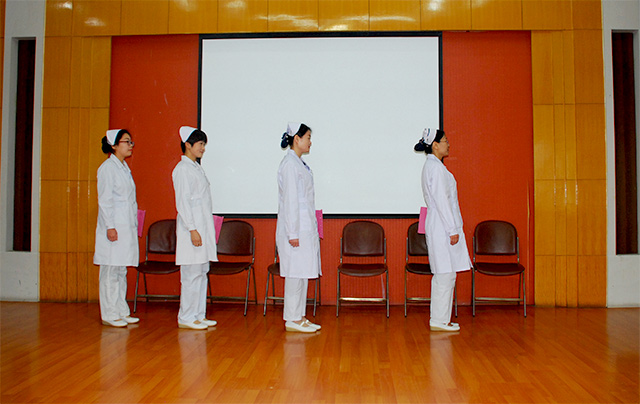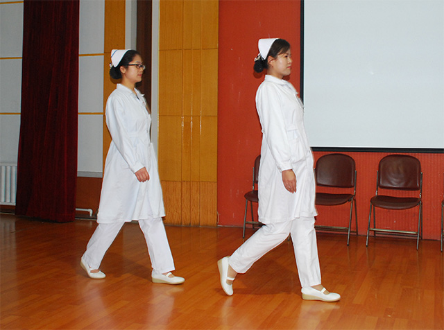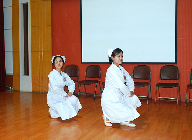 ?。ㄗ耍罕硌葑说淖o(hù)士謙遜,誠懇,嫻靜而又端莊。她們整理衣裙,入坐輕穩(wěn),腰背挺直,兩臂放松,雙膝并攏,小腿后收,雙手輕握,自然放于雙膝上。每個細(xì)小的動作她們都一絲不茍。