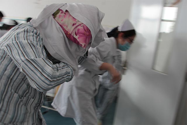 在消化內(nèi)科病房,上演的是地震時人員的撤離以及醫(yī)療護理工作的順利開展。下午三點,科室成員正在正常工作,突然發(fā)現(xiàn)桌椅及水杯等出現(xiàn)晃動,李玲護士長喊話:地震了,大家趕緊躲避!科室醫(yī)護人員果斷做出判斷,科室人員及患者、家屬以最快的速度拿起枕頭,書本等頂?shù)筋^上,安排行動不便的患者盡量靠墻角位置蹲下,并將無法行動的患者用被套包裹轉運到安全區(qū)域,撤離工作緊張而有序的開展,未落下一名病人。