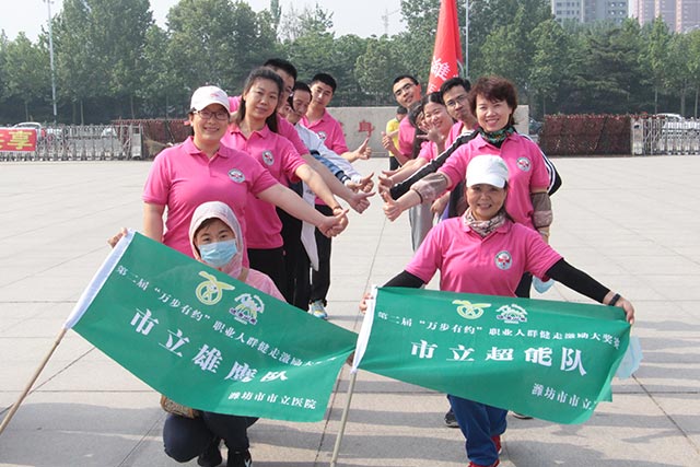 為降低職業(yè)人群慢性病發(fā)病率,促進職業(yè)人群身體健康,讓職業(yè)人群堅持健走,走出快樂,走出健康。5月10日上午,第二屆“萬步有約”職業(yè)人群健步走激勵大獎賽啟動儀式暨“關(guān)愛骨骼 躍動青春”健行鳶都大地在濰坊市奧體中心隆重舉行。本次活動由濰城區(qū)人民政府主辦,濰城區(qū)疾病預(yù)防控制中心、濰坊市體育中心、濰坊市國民體質(zhì)監(jiān)測中心承辦。濰坊市市立醫(yī)院作為代表隊伍,參加了本次“關(guān)愛骨骼 躍動青春”悅跑活動。