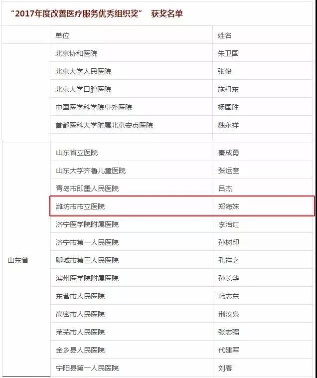 據(jù)悉,同時(shí)榮獲“2017年度改善醫(yī)療服務(wù)示范醫(yī)院”還有山東省立醫(yī)院、濰坊市中醫(yī)院等醫(yī)院,榮獲“2017改善醫(yī)療服務(wù)優(yōu)秀管理者”還有山東省立醫(yī)院院長秦成勇,高密市人民醫(yī)院院長荊汝泉等醫(yī)院管理者。