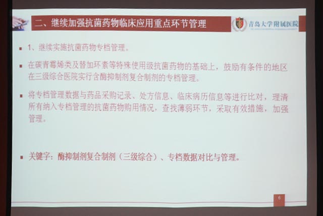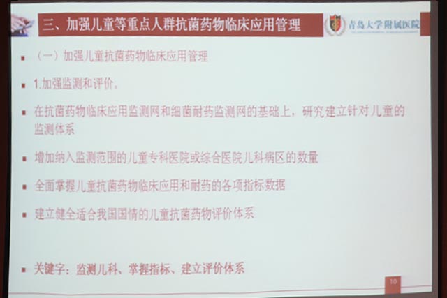 隋忠國主任著重講解了《抗菌藥物管控新進展》。他首先對我國抗菌藥物的應用現(xiàn)狀和細菌耐藥現(xiàn)狀做了簡單介紹,并針對抗菌藥物臨床藥物應用的基本原則等方面進行了解讀。他結合青大附院的工作,從加快建設多學科抗菌藥物管理和診療團隊、加強抗菌藥物臨床應用重點環(huán)節(jié)管理、加強兒童等重點人群抗菌藥物臨床應用管理、加強抗菌藥物監(jiān)測評價和公眾宣傳、開展抗菌藥物臨床應用階段性評估工作等方面結合具體案例、具體數(shù)據對抗菌藥物的合理應用進行了講解。