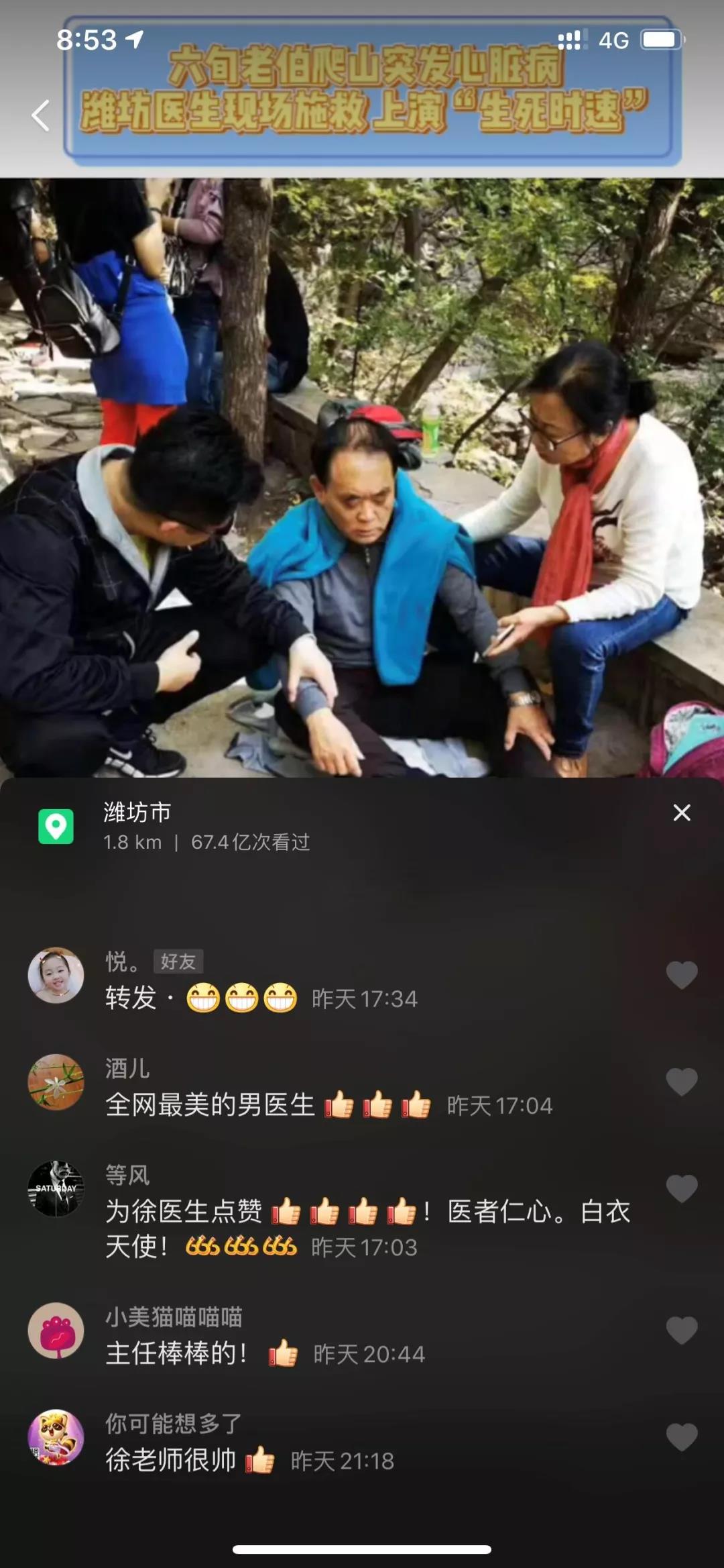 賈大爺經(jīng)過多方打聽找到濰坊市市立醫(yī)院,發(fā)來照片我們才得知是徐加錕主任。當小編找到徐主任時,徐加錕表示自己是一名醫(yī)生,這是應(yīng)該做的,不需要采訪。經(jīng)過小編幾次溝通,徐主任才將當時的情況進行了簡單說明。當時他在爬山途中,看到有人圍觀,并有人喊“有人暈倒了”,出于醫(yī)生的職業(yè)特性,他毫不猶豫,立即趕到事發(fā)地點,進行急救,最終老人轉(zhuǎn)危為安。
