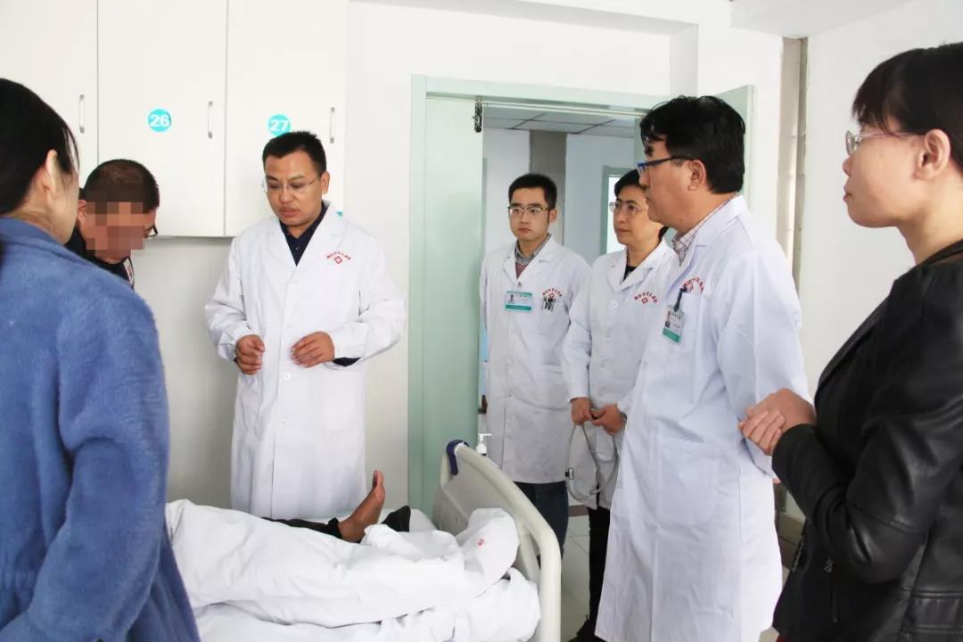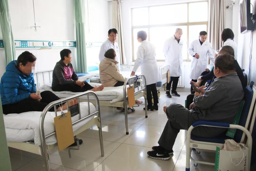 講座結(jié)束后,山東第一醫(yī)科大學(xué)第一附屬醫(yī)院(千佛山醫(yī)院)骨創(chuàng)傷外科副主任張春明博士在山醫(yī)集團(tuán)副主席、濰坊市市立醫(yī)院副院長靳清漢院長,副院長鄒晨容,內(nèi)分泌代謝科主任李曉靜的陪同下走進(jìn)我院內(nèi)分泌病區(qū),為糖尿病足及糖尿病周圍神經(jīng)病變的糖友們現(xiàn)場“把脈問診”,張春明博士結(jié)合糖友們的實(shí)際情況,認(rèn)真分析了他們的病情并為他們制定了下一步的診療方案,將省級金牌醫(yī)療服務(wù)送到了百姓家門口。
