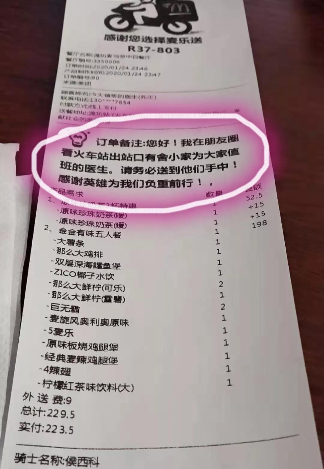 1月24日(除夕)23時左右,濰坊市火車站出站口發(fā)生暖心一幕,一名陌生人通過外賣員給火車站值守天使送來了暖心年夜飯,并附言“您好,我在朋友圈看火車站出站口有舍小家為大家值班的醫(yī)生。請務(wù)必送到他們手中!感謝英雄為我們負重前行!”