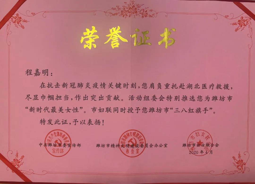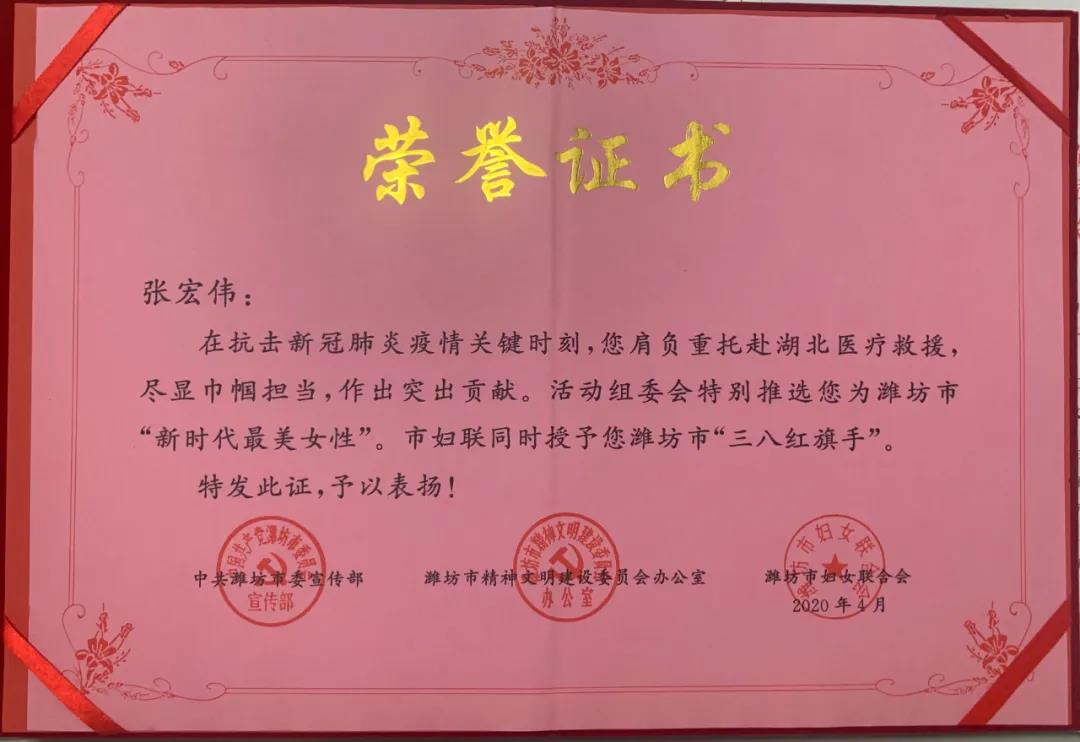 2019年12月,為迎接2020年“三八”國際勞動婦女節(jié)110周年,以先進(jìn)榜樣激勵廣大女性和家庭在現(xiàn)代化高品質(zhì)城市建設(shè)中再立新功,中共濰坊市委宣傳部、市文明辦、市婦聯(lián)在全市開展了尋找“新時代最美家庭、最美女性”活動。經(jīng)過各項程序,我院呼吸內(nèi)科張宏偉醫(yī)生、程嘉明護(hù)士被授予濰坊市“新時代最美女性”及“三八紅旗手”。