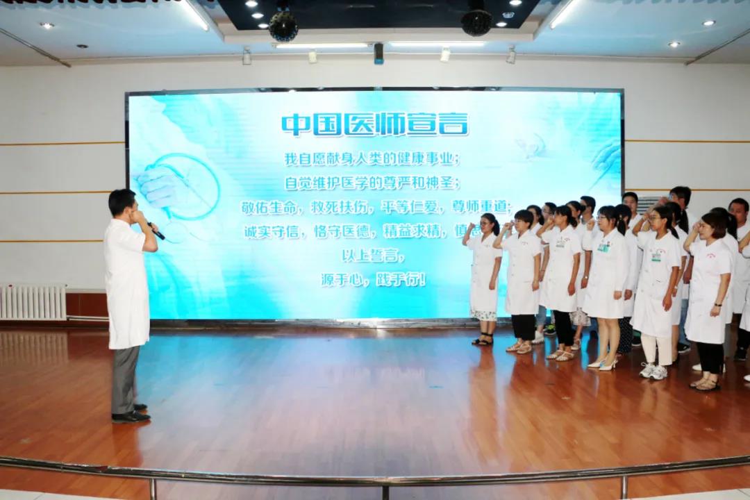 “我志愿獻(xiàn)身人類的健康事業(yè);自覺維護(hù)醫(yī)學(xué)的尊嚴(yán)和神圣;敬佑生命,救死扶傷,平等仁愛,尊師重道;誠實守信,恪守醫(yī)德,精益求精,慎思篤行;以上誓言,源于心,踐于行!” 市立醫(yī)院副院長解魯明帶領(lǐng)全體醫(yī)師們共同莊嚴(yán)地宣讀了《中國醫(yī)師宣言》宣誓誓詞。醫(yī)師們高舉右手,鏗鏘有力的宣誓聲在會場響起。這一刻,無比神圣。
