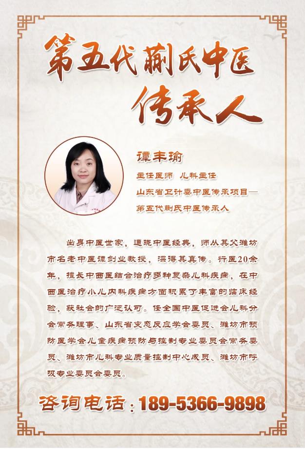 山東省衛(wèi)計(jì)委中醫(yī)傳承項(xiàng)目“第五代蒯式中醫(yī)傳承人”、兒科主任——譚豐瑜