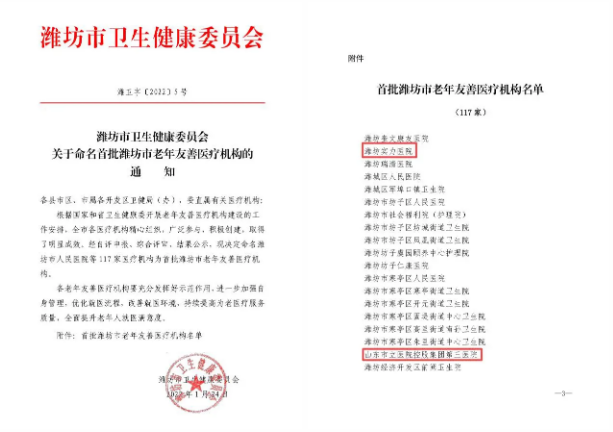 近年來(lái),我國(guó)老齡化程度不斷加深,為積極響應(yīng)國(guó)家關(guān)于加快推進(jìn)老年友好社會(huì)和健康中國(guó)建設(shè)號(hào)召,我院及山醫(yī)三院結(jié)合老年人需求和本院實(shí)際情況,積極開(kāi)展老年友善建設(shè)相關(guān)工作,并于2022年1月順利通過(guò)現(xiàn)場(chǎng)評(píng)審,獲評(píng)“首批濰坊市老年友善醫(yī)療機(jī)構(gòu)”。