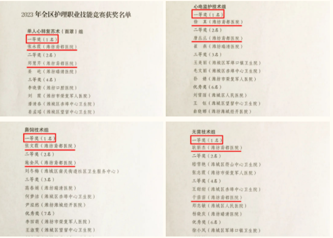 滿載喜訊!我院在濰城區(qū)衛(wèi)健局組織舉辦的2023年全區(qū)護(hù)理職業(yè)技能競(jìng)賽中喜獲佳績(jī)!在四項(xiàng)競(jìng)賽科目中,我院派出的張永霞、徐真、張文霞、耿新杰、鄭慧芹、唐叢叢、施金鳳、于苗苗八位參賽選手憑借出色的表現(xiàn),包攬四項(xiàng)一等獎(jiǎng),并斬獲三個(gè)二等獎(jiǎng),一個(gè)三等獎(jiǎng)的好成績(jī)!