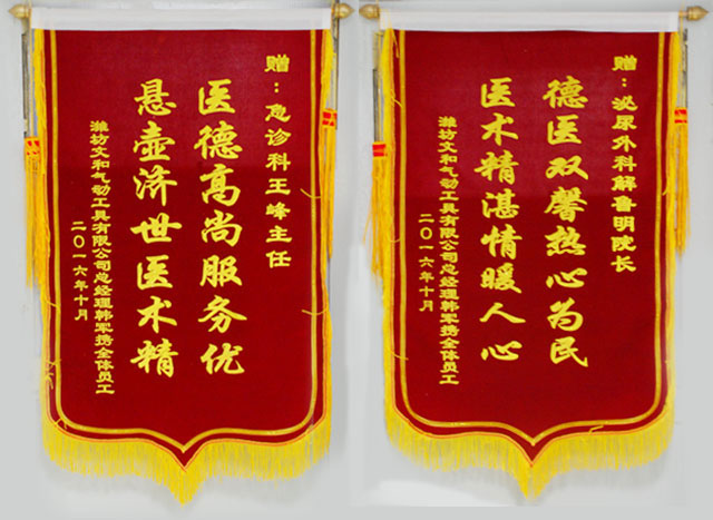 10月14日,濰坊文和氣動(dòng)工具有限公司將兩面錦旗送到我院,錦旗上分別寫著"懸壺濟(jì)世醫(yī)術(shù)精,醫(yī)德高尚服務(wù)優(yōu)"和"醫(yī)術(shù)精湛情暖人心,德醫(yī)雙馨熱心為民",感謝我院院長(zhǎng)助理、泌尿科主任解魯明和急診科副主任、副主任醫(yī)師王峰為其做的急救知識(shí)培訓(xùn)。