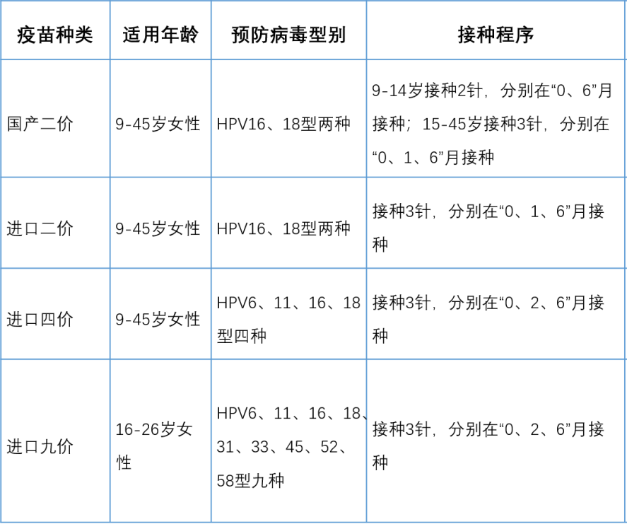 近幾年,隨著宮頸癌防治知識的普及,越來越多的國內(nèi)女性選擇主動接種HPV疫苗。目前市場上供應的疫苗有國產(chǎn)二價和進口的二價、四價、九價疫苗。各類HPV疫苗對比如下圖: