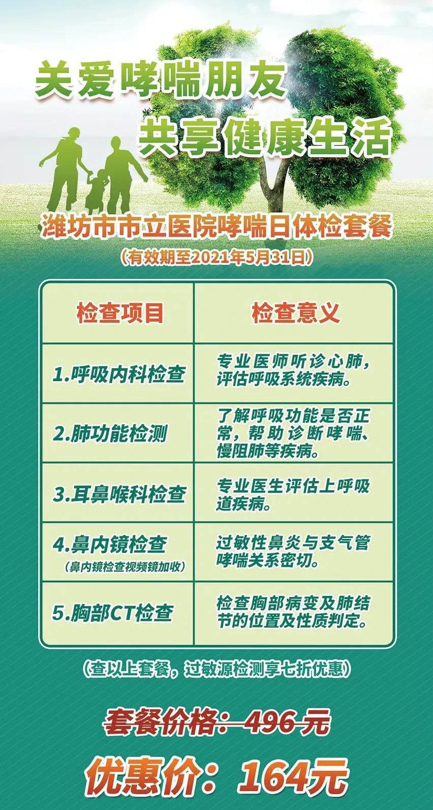 濰坊市市立醫(yī)院特推出以“關(guān)愛(ài)哮喘朋友 共享健康生活”為主題的哮喘日體檢套餐,內(nèi)含評(píng)估呼吸系統(tǒng)疾病等多項(xiàng)檢查,為您和家人的健康生活保駕護(hù)航。